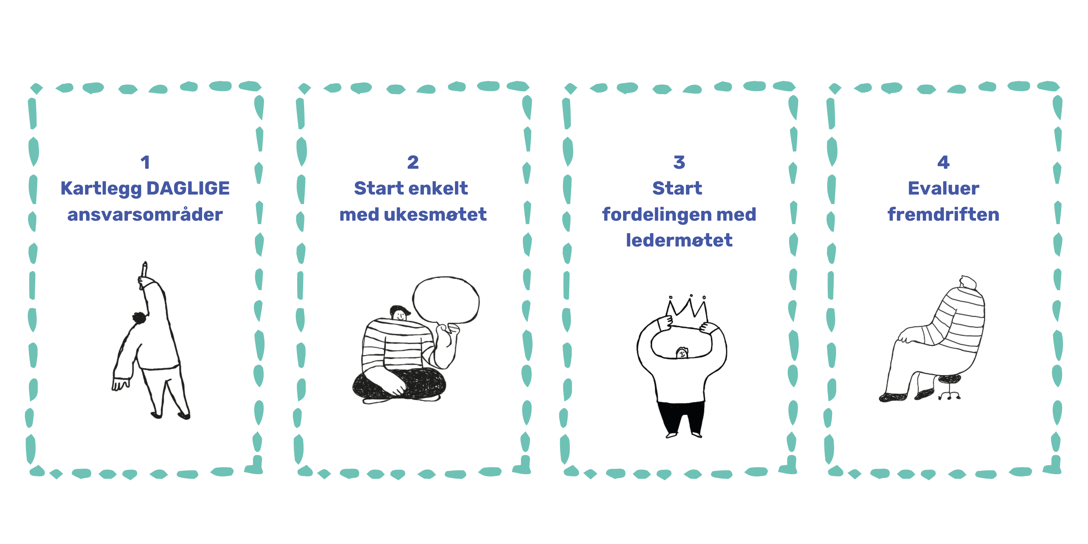 Vi bruker samarbeidsmodellen vår. Kartlegg alt arbeidet først, start enkelt med ukesmøtet, jobb videre med ansvarsområder på ledermøtet, og til sist evaluer hvordan familieorganisasjonen fungerer etter endringene.